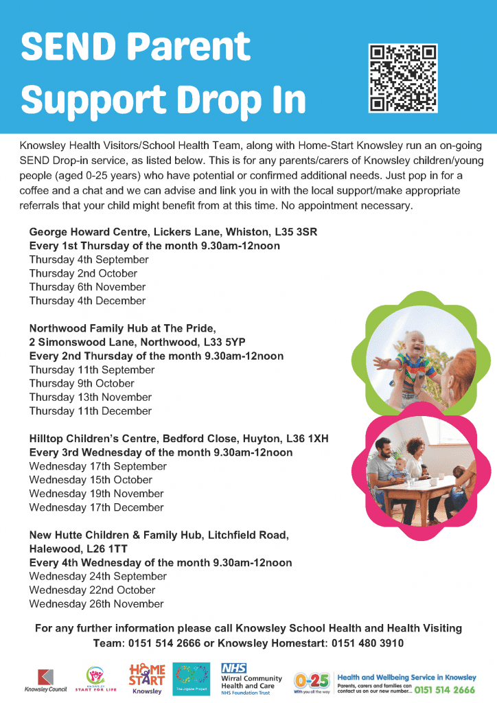 Come along to our weekly Parend SEND Drop-ins across Knowsley for Parents/Carers with children with complex needs. (A diagnosis is not necessary) Come and talk through your challenges with like minded people in a safe non-judgemental environment.